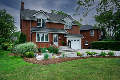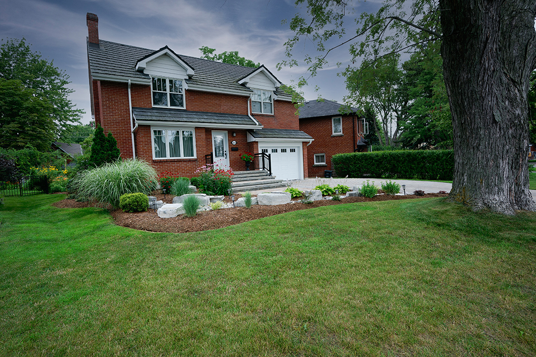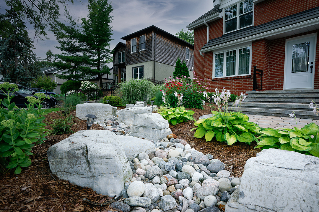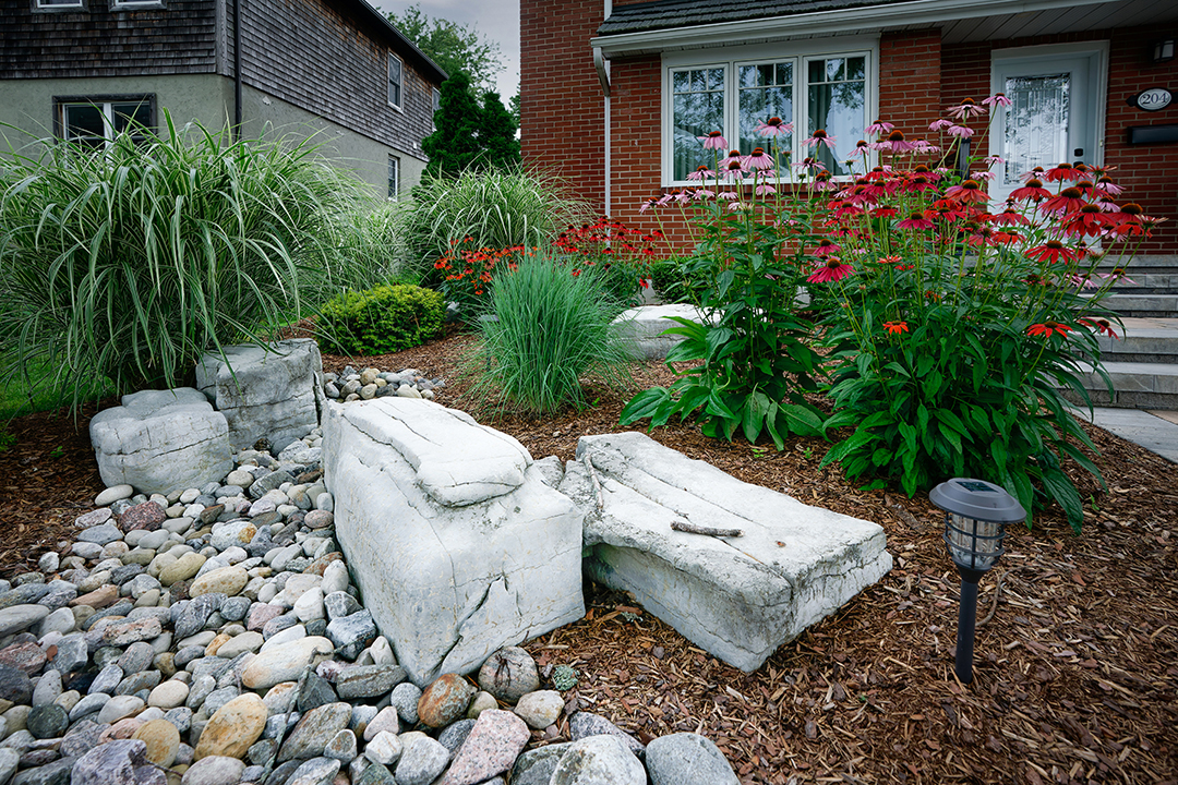 A water conscious project in which eve troughs, a sump pump and much neighbouring water is absorbed into a clear stone "French drain" under an ancient silver maple with overflow into a permeable driveway.