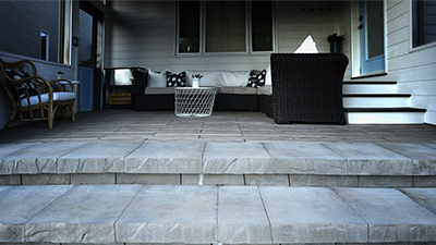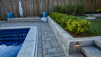 Extending backyard living space on a heavy slope with block retaining walls.